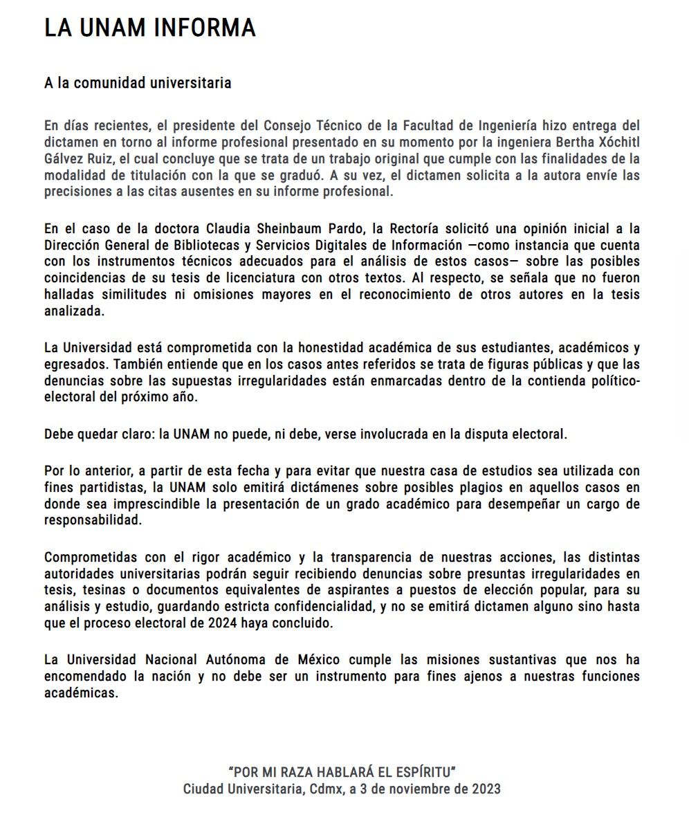 "Por lo anterior, a partir de esta fecha y para evitar que nuestra casa de estudios sea utilizada con fines partidistas, la UNAM solo emitirá dictámenes sobre posibles plagios en aquellos casos en donde sea imprescindible la presentación de un grado académico para desempeñar un cargo de responsabilidad", anunció.