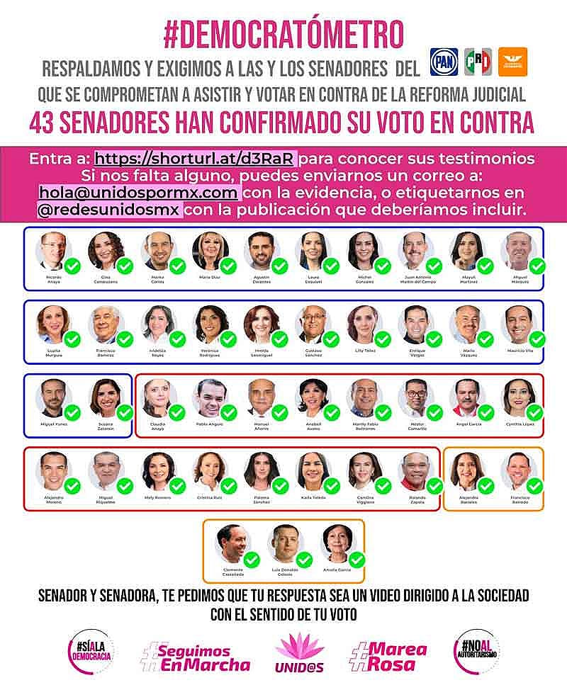 14:00hrs. del 6 de sep: está completo el “democratómetro. 43 de 43 senadoras y senadores de oposición han confirmado que votarán en contra de la nociva reforma judicial.