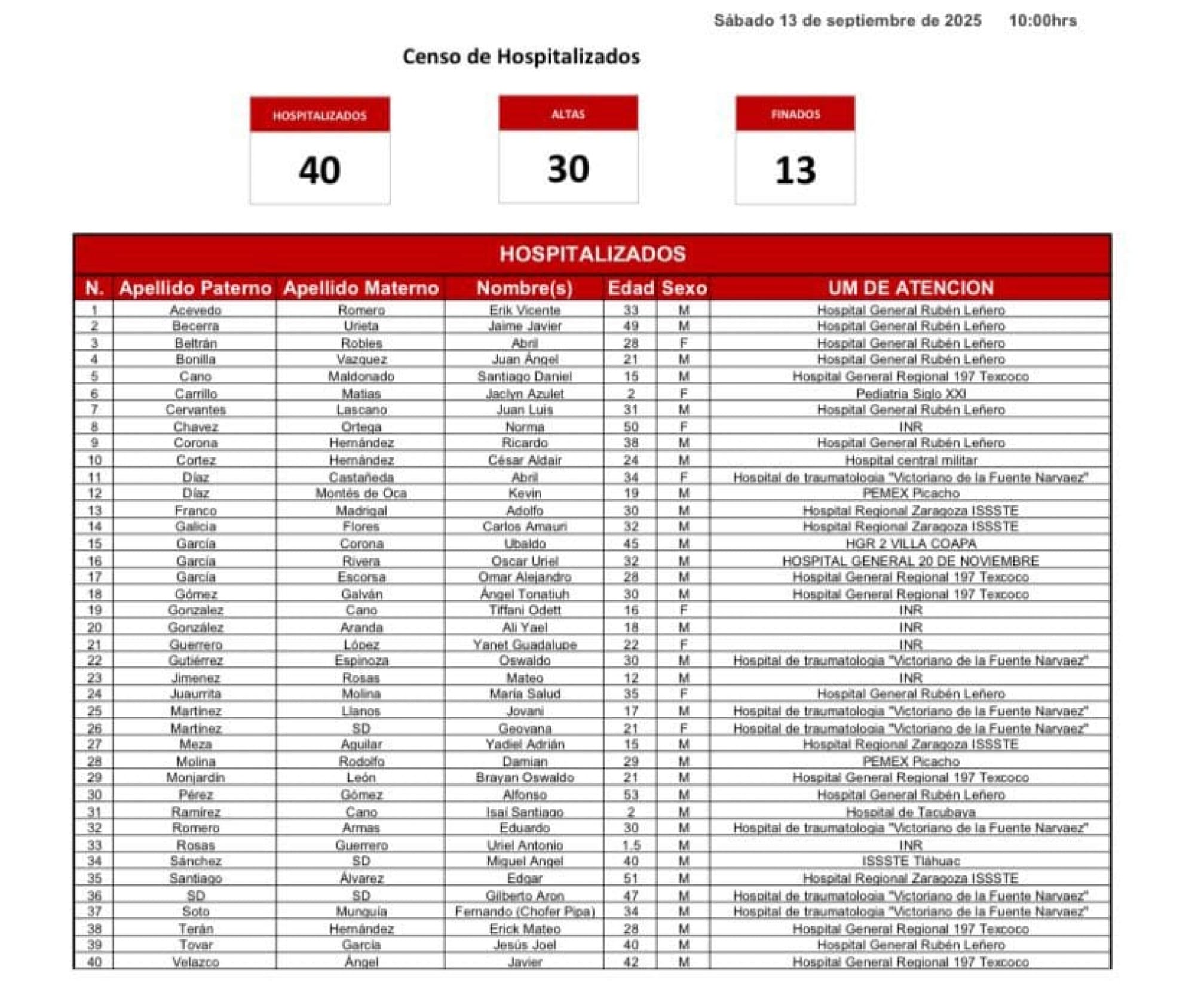 En su cuenta en la red social X, la Secretaría de Salud Pública de la CDMX informó sobre la muerte de dos personas más que se encontraban hospitalizadas, por lo que la cifra de víctimas fatales se elevó a 13.