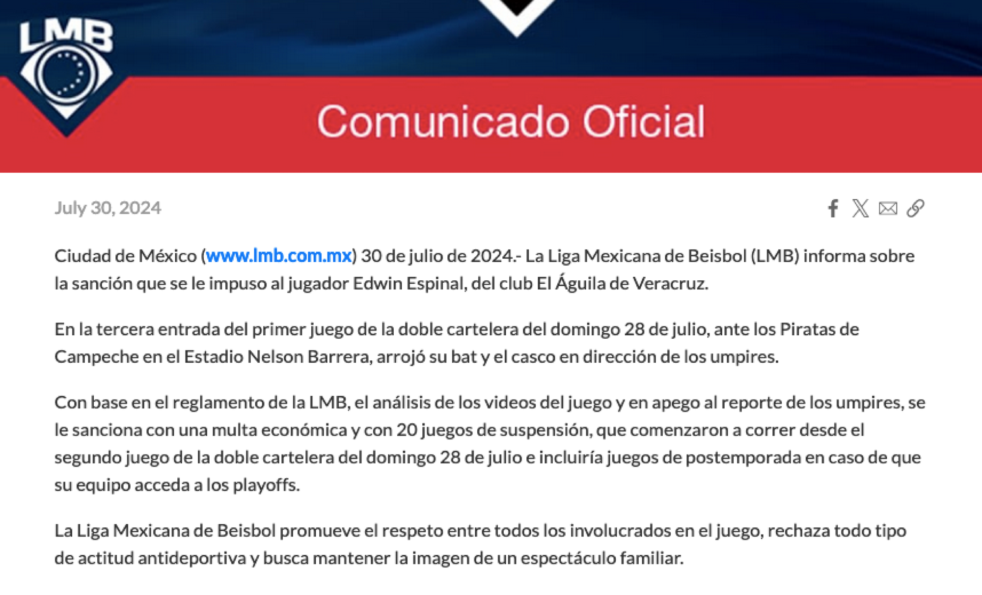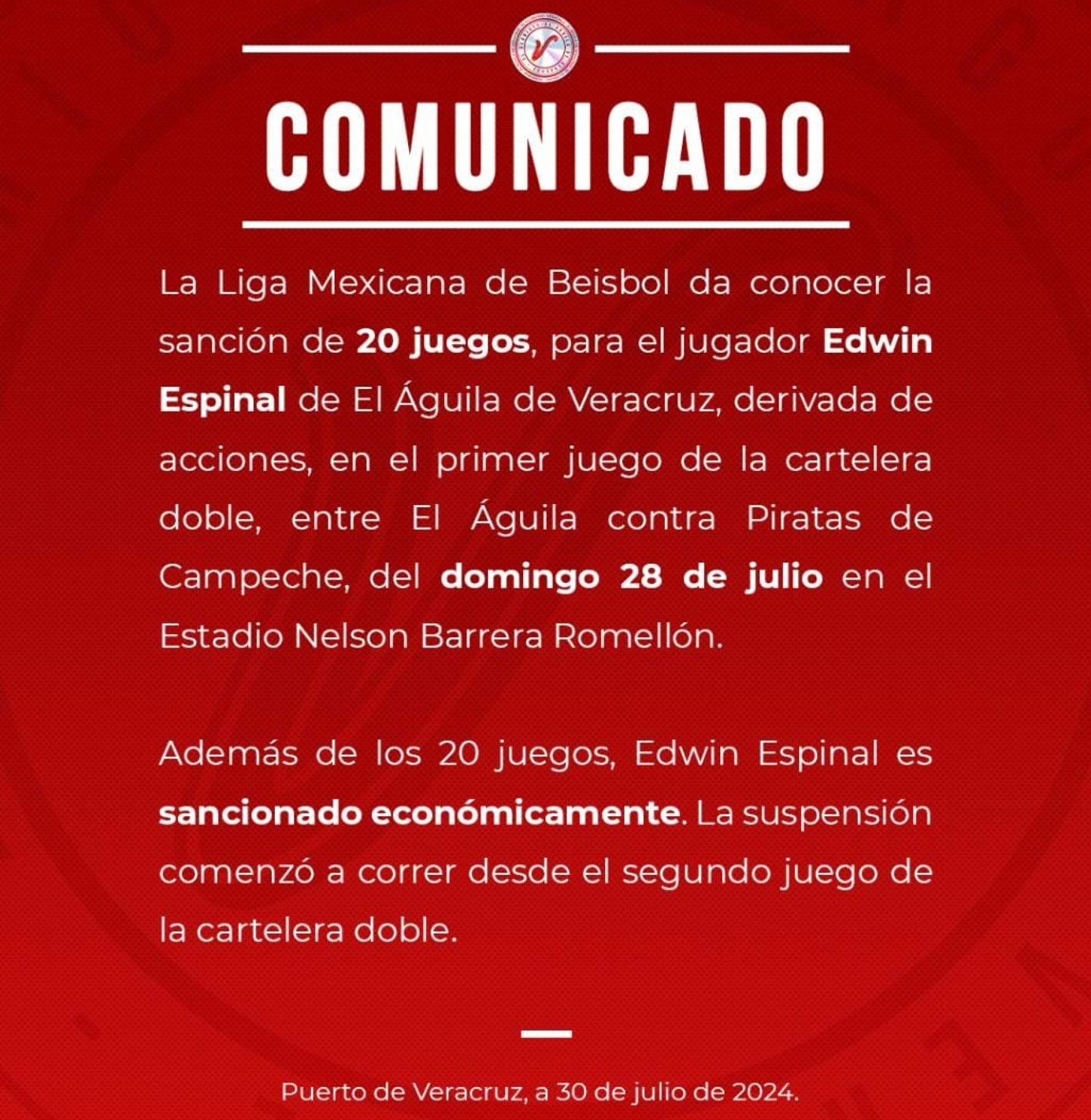 (AVC) La Liga Mexicana de Béisbol (LMB) sancionó con 20 juegos de suspensión y una multa económica al primera base de El Águila de Veracruz, Edwin Espinal, por la conducta antideportiva demostrada en el primer juego de la cartelera doble entre la novena jarocha y Piratas de Campeche, del 28 de julio en el estadio Nelson Barrera.
