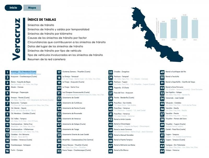 La estadística de siniestros de tránsito en el año 2022 de la Secretaría de Comunicaciones y transporte, revela que en Veracruz hay cinco vialidades donde más se han presentado accidentes.