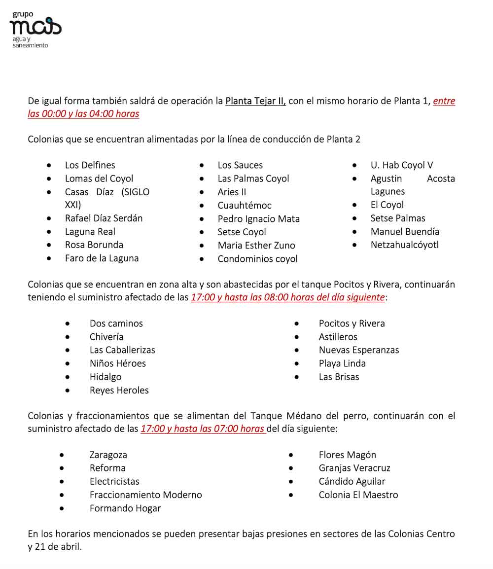 En un comunicado dijeron que se ven en la necesidad de continuar poniendo fuera de operación la Planta Tejar 1, por un período de 4 horas diarias entre las 00 horas y las 4 de la madrugada, durante ese lapso el suministro de agua se suspende en 49 colonias.