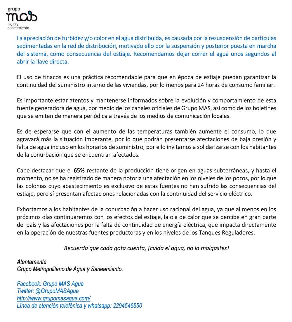 El grupo operador del agua en esta zona metropolitana, el Grupo MAS, dio a conocer afectaciones en abastecimiento por la temporada de este año 2024, tras un monitoreo más intenso al Río Jamapa.