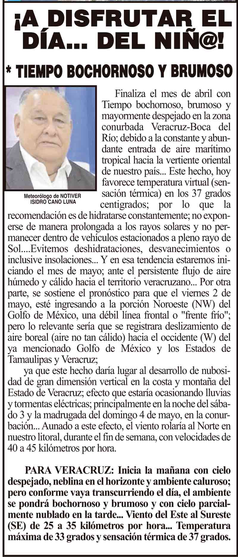 PRIMERA ¡A DISFRUTAR EL DÍA... DEL NIÑ@! - * TIEMPO BOCHORNOSO Y BRUMOSO 30 abril 2025 Más Noticias ¡YA TIENE PUENTAZO EL SEGURO! ¡LA CARTELERA! | LA ÚLTIMA Y NOS VAMOS - De vacaciones andamos en Papantla, Veracruz, y en días pasados escuchamos dos charlas sobre los exploradores y la iconografía del basamento de los Nichos y El Tajín, en el Museo Teodoro Cano… ¡MAESTROS TENDRÁN BONO Y AGUINALDO! ¡LES MOCHAN EL AGUA A RÍO MEDIO! - *Por mantenimiento ¡SALE HUMO DE LAS ALCANTARILLAS! - *Explosiones en Jardines de Mocambo ¡LEY GARROTE! - *Paguen ya impuestos o van multas ¡YA TIENE MURAL TITO NIEVES! ¡PRESENTA LOTERÍA NACIONAL EL ÁLBUM DEL MUNDIAL! LOS CARTONES ¡PREVENCIONES PARA EVITAR EL INCREMENTO DE LAS INFECCIONES RESPIRATORIAS AGUADAS!