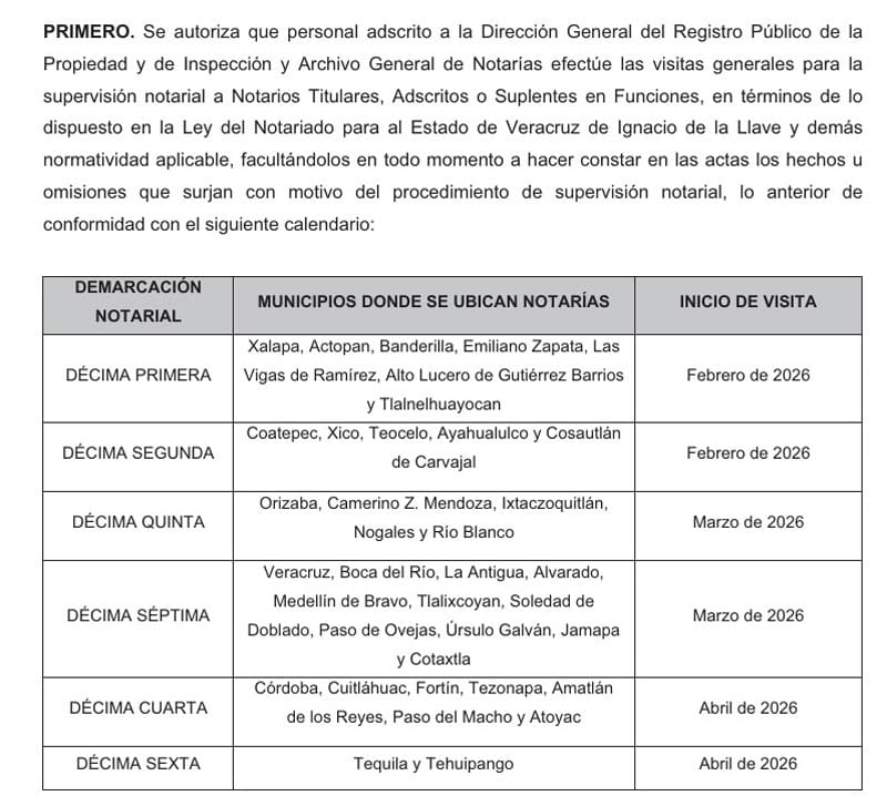 De acuerdo con el calendario oficial de la Dirección General del Registro Público de la Propiedad, las revisiones iniciaron este mes de febrero de 2026 en las demarcaciones de Xalapa y Coatepec.