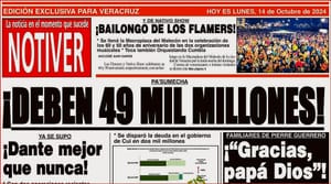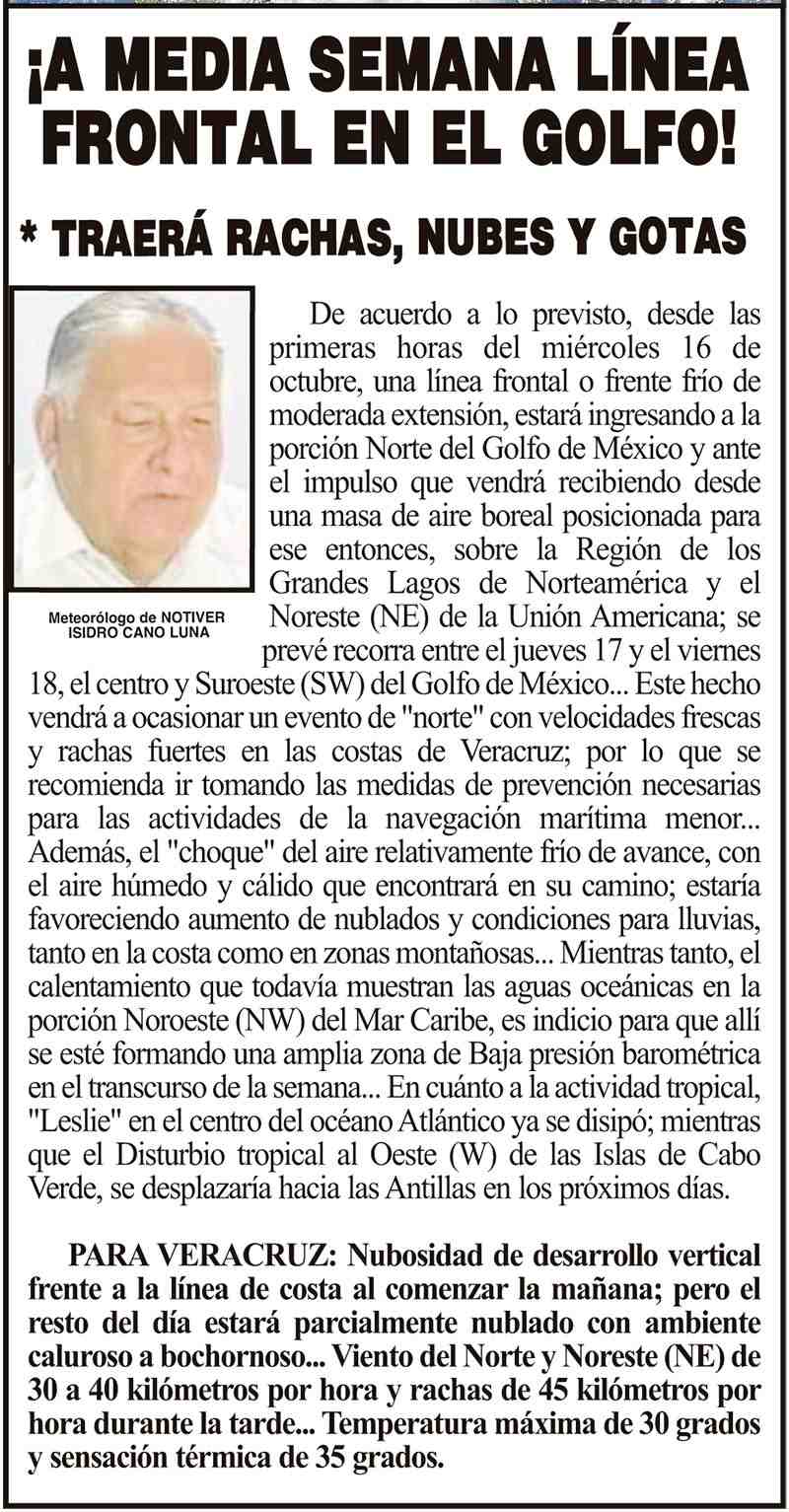 PRIMERA ¡A MEDIA SEMANA LÍNEA FRONTAL EN EL GOLFO! - **TRAERÁ RACHAS, NUBES Y GOTAS 14 octubre 2024 Más Noticias ¡CAZARÍN LE TRAJO LA BILLETIZA! - A LOS ABUELITOS ¡NO HAY AGUA EN OCHO COLONIAS! - *Por una fuga en la red ¡EJECUTAN A FOTÓGRAFO! - EN CÓRDOBA ¡SENTENCIA HISTÓRICA! - CASO ASCENCIO ¡OTRA CALLE MÁS! ¡MUERE DIEGO FERNÁNDEZ! - “EL PAMPANO” ¡FALLECE HERMANO DE REYNALDO! ¡METEN TIJERA! - MOLES ¡SE COLAPSÓ! - EL COCOTERO DE ÁLAMO LA ENCUESTA | - CATAPLÚM!