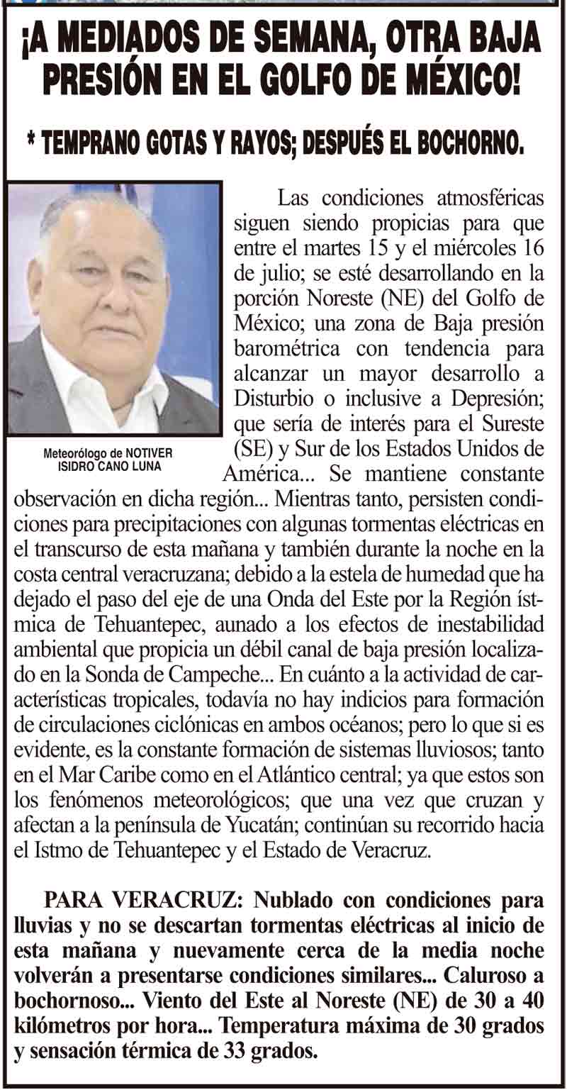 PRIMERA ¡A MEDIADOS DE SEMANA, OTRA BAJA PRESIÓN EN EL GOLFO DE MÉXICO! - *TEMPRANO GOTAS Y RAYOS; DESPUÉS EL BOCHORNO. 13 julio 2025 Más Noticias LA PORTADA - VIERNES 5 DE DICIEMBRE 2025 ¡HOY SOPLA FRESCO Y DE FRENTE! - *PERO EL LUNES 8, ESTARÁ FUERTE Y CON LLUVIAS. LA ENCUESTA | - ME ESTÁS OYENDO INÚTIL?... ¡CON BAILONGOS QUIEREN AYUDAR A LOS DAMNIFICADOS DEL NORTE! - *El mismo Alor, toca los timbales ¡YA SE LA APROBARON! - REFORMA PARA LA FISCALÍA ESTATAL NOTI-MEME | - ASÍ ESTUVO EL INFORME... ¡MÁS DE 9 MIL MILLONES! - *Eso costaría cancelar en Veracruz al Grupo MAS ¡LE DAN LUZ VERDE! - DESDE GUATEMALA ¡EL CUARTO! ¡Y COM-PA-RE-CIÓ! - ÁNDALE...