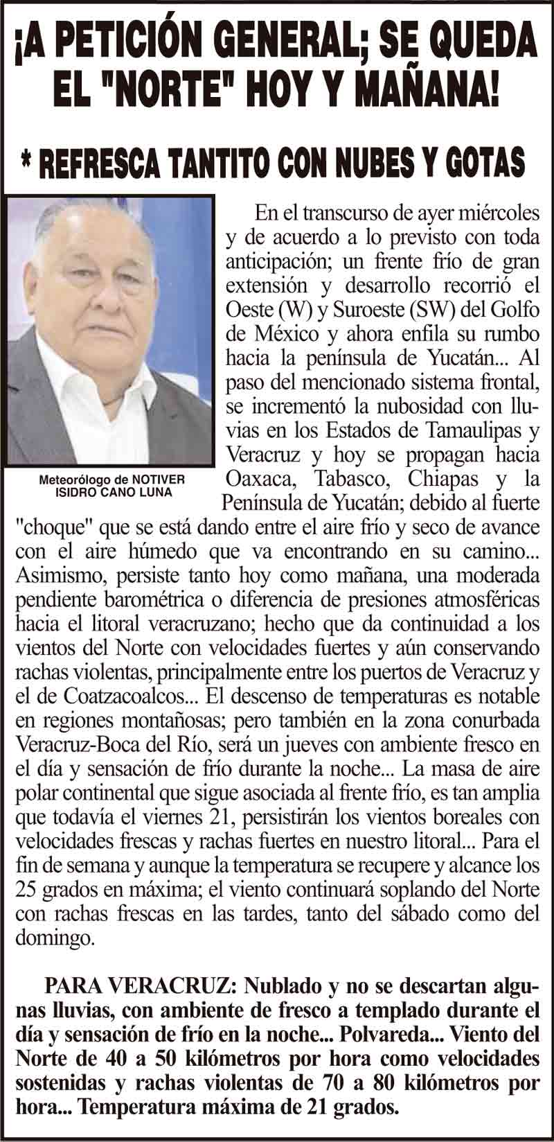 PRIMERA ¡A PETICIÓN GENERAL; SE QUEDA EL "NORTE" HOY Y MAÑANA! - *REFRESCA TANTITO CON NUBES Y GOTAS 20 febrero 2025 Más Noticias ¡YA HAY TERNA! - RAÚL PEIMBERT EN LA LISTA ¡“CEMENTERIO”! - DE ULÚAS ¡INAUGURA PATY OTRA CALLE! ¡NO LE CREYERON! - Y LO BUSCAN NOTI-MEME | - ECOS DEL INFORME! ¡VERÓNICA VA CON NAHLE! - Y AL CONGRESO ¡“FAST TRACK”! - *Mientras el Mariner salía y entraba de Pajaritos en Coatzacoalcos ¡OPERATIVO LUPE-REYES! ¡MANDAN LA BILLETIZA! - *Corea manda 150 mil dólares ¡CRISTINA GANA LA ELECCIÓN!