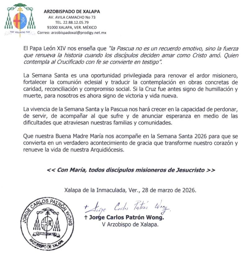 La Arquidiócesis de Xalapa, encabezada por el Arzobispo Jorge Carlos Patrón Wong, emitió un mensaje con motivo de la Semana Santa 2026 y señaló que se trata de una "semana de gracia, vida y renovación".