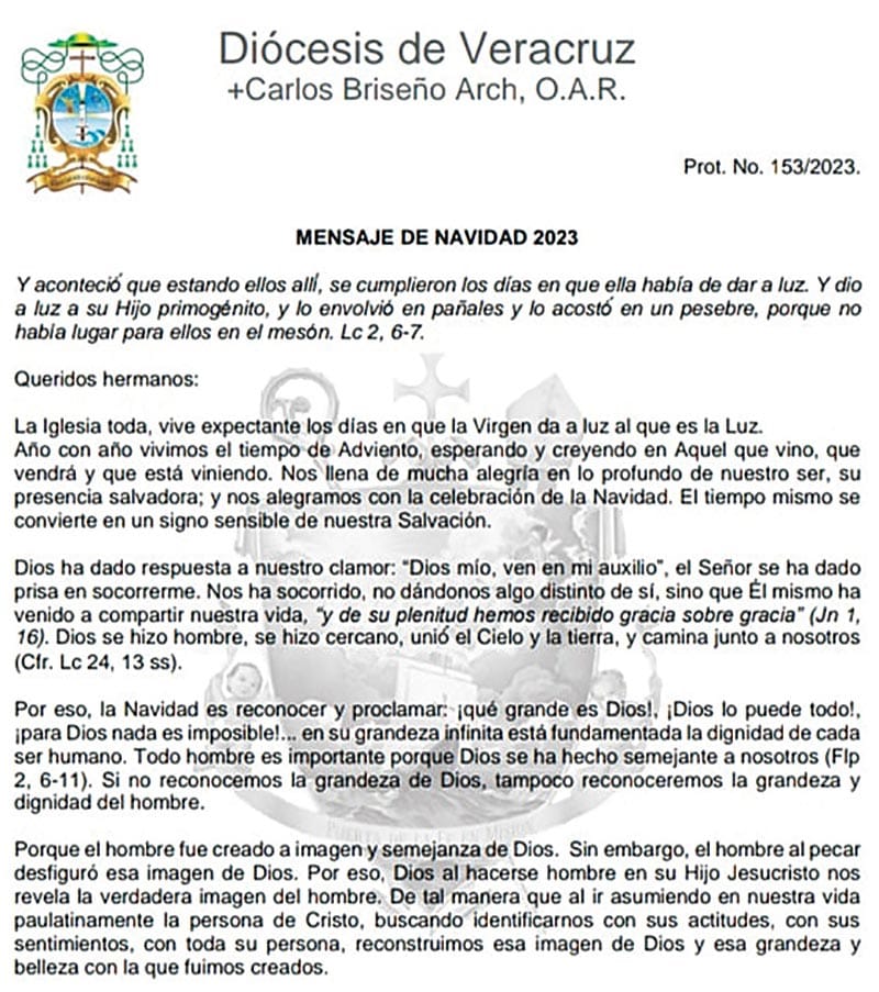 En el marco de la celebración de las Fiestas de Navidad, el Obispo de la Diócesis de Veracruz Carlos Briseño Arch, emitió el mensaje navideño 2023 en donde insistió a la sociedad veracruzana a "hacer el bien".