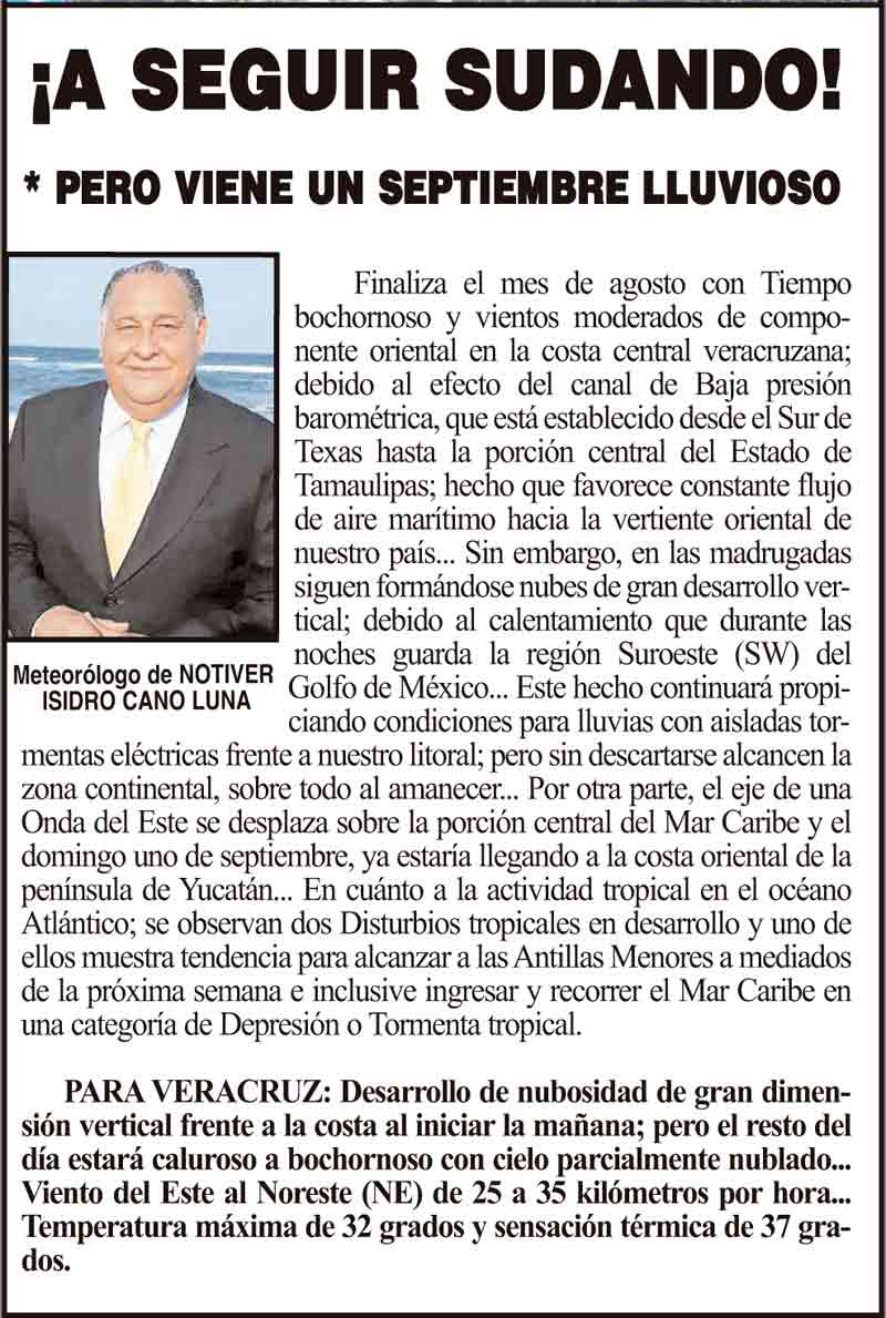 PRIMERA ¡A SEGUIR SUDANDO! - *PERO VIENE UN SEPTIEMBRE LLUVIOSO 30 agosto 2024 Más Noticias LA PORTADA - DOMINGO 14 DE DICIEMBRE 2025 ¡"NORTE" ARRACHADO CON NUBLADOS Y LLUVIAS! - *OTRO FRENTE FRÍO RECORRE EL GOLFO DE MÉXICO ¡ASESINAN A EX CANDIDATO A LA ALCALDÍA DE MISANTLA! - *Era del Movimiento Ciudadano ¡HOMENAJE PÓSTUMO AL “PAPO”! ¡SE VA EL FOFO! - DEL PRI LA ENCUESTA | - FELICIDADES! ¡SE DESCARRILA EL TREN! - PA’SUSTO ¡YA NO COBRARÁN PARQUÍMETROS! ¡SE VAN POR LAS NUBES LOS PAVOS! ¡DETECTAR DISFAGIA A TIEMPO PREVIENE LAS COMPLICACIONES DE SALUD: IMSS VERACRUZ NORTE!