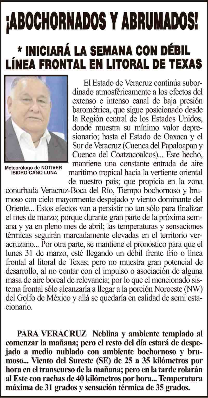 PRIMERA ¡ABOCHORNADOS Y ABRUMADOS! - *INICIARÁ LA SEMANA CON DÉBIL LÍNEA FRONTAL EN LITORAL DE TEXAS 29 marzo 2025 Más Noticias ¡LOS DEJARON SOLOS! - MORENA VUELVE A REVENTAR SESIÓN ¡VIENEN DESDE COLOMBIA A LA NAVAL! LOS CARTONES ¡NI MEDICAMENTOS NI UNIFORMES! - *En hospital de Boca del Río ¡SE TRAEN CUMBRE AUTOMOTRIZ! ¡REBAMBARAMBA! - MANIOBRISTAS VS. MANIOBRISTAS ¡LO HOMOLOGAN! - *El feminicidio en Veracruz ¡MEGA-CABALGATA! ¡JUSTICIA PARA BERTHA! - MARCHAS POR LA DOCTORA ¡YA HAY PLAN DE DESARROLLO!