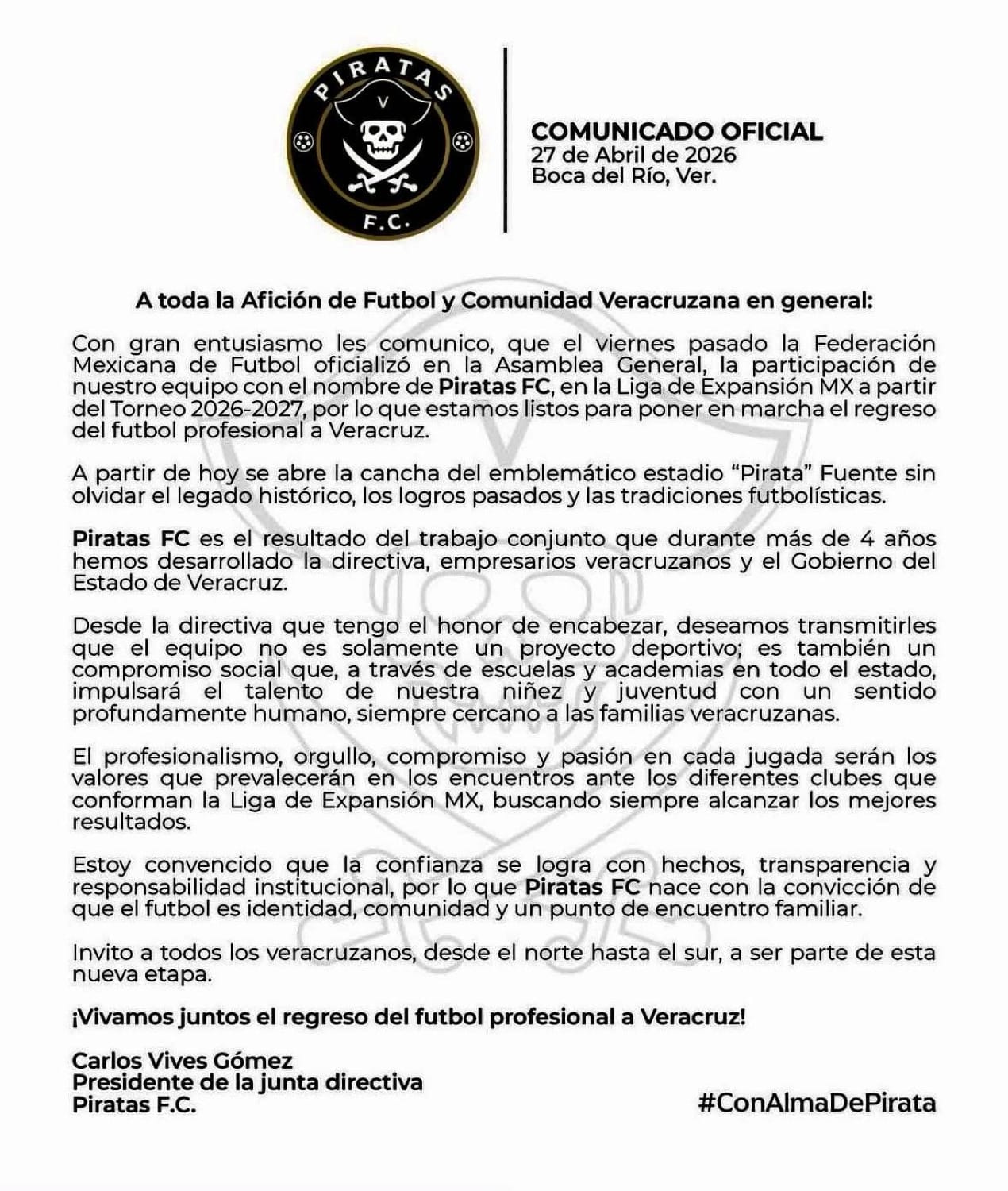 El empresario José Carlos Vives hizo oficial la ocupación del estadio Luis Pirata Fuente y su apertura, destacó que fueron cuatro años de lucha para poder concretar el proyecto Piratas FC, que llega a primera división y regresa el fútbol a Veracruz, entre empresarios y Gobierno del Estado.