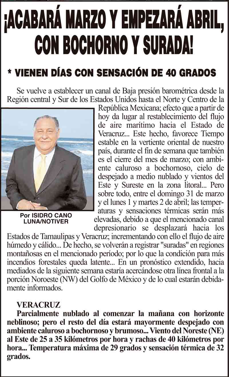 PRIMERA ¡ACABARÁ MARZO Y EMPEZARÁ ABRIL, CON BOCHORNO Y SURADA! - *VIENEN DÍAS CON SENSACIÓN DE 40 GRADOS 29 marzo 2024 Más Noticias ¡SE ESTÁ FORMANDO UN INTENSO "NORTE" PARA EL LUNES 8! - *UN FIN DE SEMANA CON CALOR, BRUMA Y DEL ESTE ¡YA HAY TERNA! - RAÚL PEIMBERT EN LA LISTA ¡“CEMENTERIO”! - DE ULÚAS ¡INAUGURA PATY OTRA CALLE! ¡NO LE CREYERON! - Y LO BUSCAN NOTI-MEME | - ECOS DEL INFORME! ¡VERÓNICA VA CON NAHLE! - Y AL CONGRESO ¡“FAST TRACK”! - *Mientras el Mariner salía y entraba de Pajaritos en Coatzacoalcos ¡OPERATIVO LUPE-REYES! ¡MANDAN LA BILLETIZA! - *Corea manda 150 mil dólares