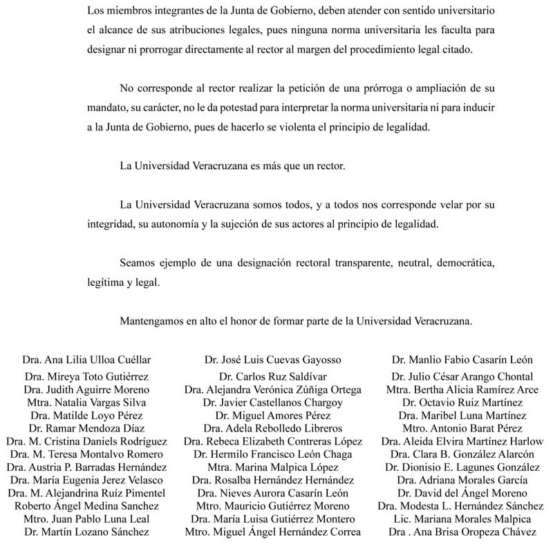 “Nosotros, académicas y académicos, estudiantes, personal administrativo, egresados y miembros de esta comunidad universitaria que aún cree en el valor de la verdad, la justicia y la educación como servicio público, alzamos la voz y los principios ante la barbarie disfrazada de procedimiento. Jamás pensamos —ni en los más oscuros pasajes de la historia institucional ni en nuestras noches más intensas de insomnio académico— vivir para ver cómo los valores universitarios eran mancillados con tan cruel descaro. Lo que hoy ocurre no es una anécdota política: es una herida abierta en el rostro de nuestra alma mater”.