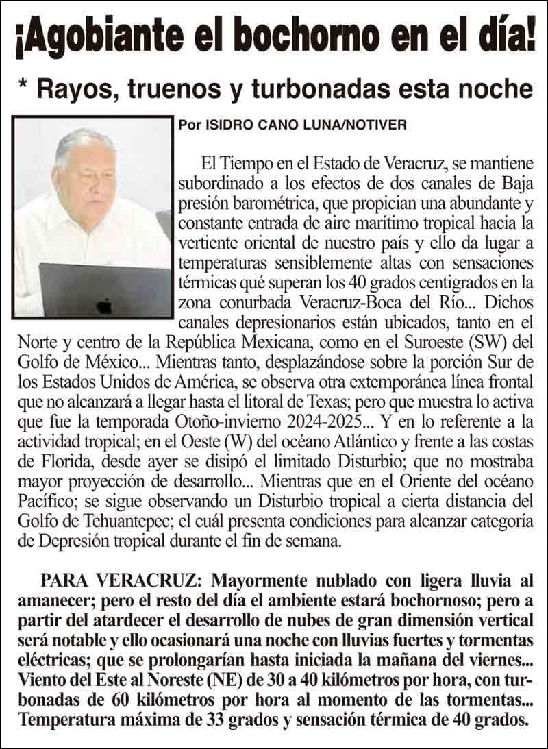 PRIMERA ¡AGOBIANTE EL BOCHORNO EN EL DÍA! - *RAYOS, TRUENOS Y TURBONADAS ESTA NOCHE 5 junio 2025 Más Noticias ¡ASESINAN A EX CANDIDATO A LA ALCALDÍA DE MISANTLA! - *Era del Movimiento Ciudadano ¡HOMENAJE PÓSTUMO AL “PAPO”! ¡SE VA EL FOFO! - DEL PRI LA ENCUESTA | - FELICIDADES! ¡SE DESCARRILA EL TREN! - PA’SUSTO ¡YA NO COBRARÁN PARQUÍMETROS! ¡SE VAN POR LAS NUBES LOS PAVOS! ¡DETECTAR DISFAGIA A TIEMPO PREVIENE LAS COMPLICACIONES DE SALUD: IMSS VERACRUZ NORTE! ¡CUATRO MUNICIPIOS SUBIRÁN EL PREDIAL! - YA SE SUPO ¡CUMBRE DE TRANSPORTE MULTIMODAL!