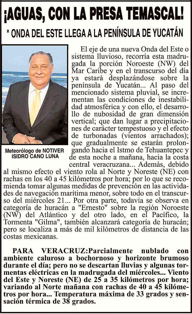 PRIMERA ¡AGUAS, CON LA PRESA TEMASCAL! - *ONDA DEL ESTE LLEGA A LA PENÍNSULA DE YUCATÁN 20 agosto 2024 Más Noticias ¡DEFIENDE EL TURISMO! - CLAUDIA ¡FUERON 4 AHOGADOS! - EN SEMANA SANTA LOS CARTONES ¡NAHLE INTERVIENE! - CASO KATHYA JOSSELYN ¡MULTARÁN A LOS ESCANDALOSOS! - *Jalan orejas a bares y restaurantes ¡HUBO 21 CRIMENES! - EN EL ESTADO ¡LOS ACALAMBRAN! - Y METEN REVERSA ¡QUE FRENEN ECOCIDIO! - ORDENA JUEZ FEDERAL ¡SUSPENDE ACTIVIDADES EN PANCHO POZA! - OTRO JUEZ FEDERAL ¡PIERDEN MILLONADA! - POR BLOQUEOS CARRETEROS
