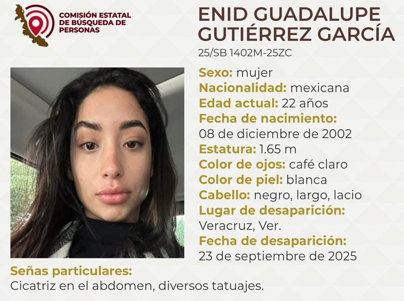 Los hechos ocurren cuando fue reportada ante la Comisión Estatal de Búsqueda la desaparición de Enid Guadalupe de 22 años de edad con todos los protocolos y la comisión emitió una ficha.