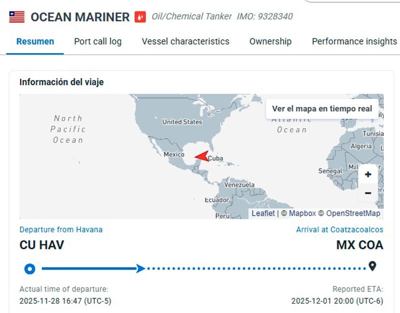 El famoso buque cubano Ocean Mariner, que traslada combustible de Coatzacoalcos a Cuba, viene de regreso, a estas alturas ya es parte del inmobiliario de la terminal de Pajaritos de Pemex, en Coatzacoalcos, nomás se fue 15 días.
