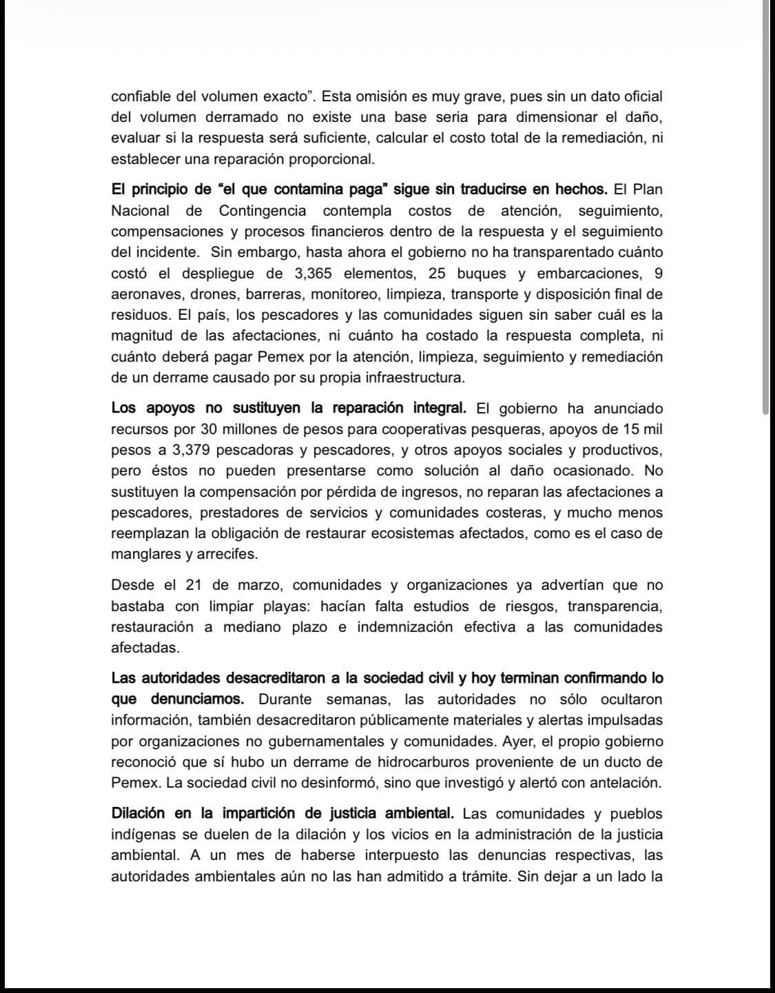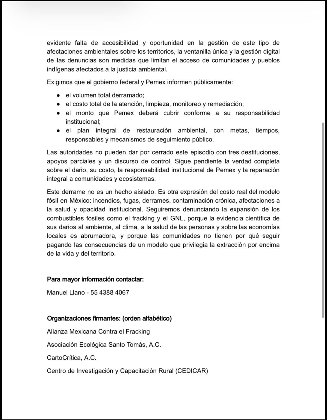 Por su parte, los residentes de la comunidad de La Concepción manifestaron su preocupación ante el impacto ambiental, señalando que el escurrimiento de hidrocarburos pone en riesgo la actividad pesquera de la zona.