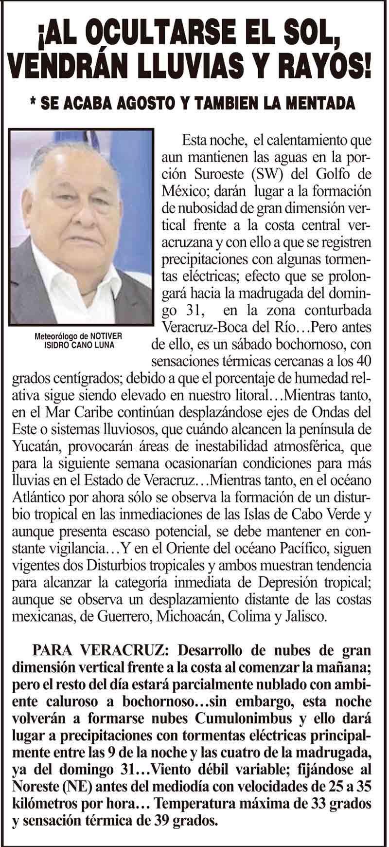 PRIMERA ¡AL OCULTARSE EL SOL, VENDRÁN LLUVIAS Y RAYOS! - *SE ACABA AGOSTO Y TAMBIÉN LA MENTADA `CANICULA´ 30 agosto 2025 Más Noticias LA PORTADA - VIERNES 5 DE DICIEMBRE 2025 ¡HOY SOPLA FRESCO Y DE FRENTE! - *PERO EL LUNES 8, ESTARÁ FUERTE Y CON LLUVIAS. LA ENCUESTA | - ME ESTÁS OYENDO INÚTIL?... ¡CON BAILONGOS QUIEREN AYUDAR A LOS DAMNIFICADOS DEL NORTE! - *El mismo Alor, toca los timbales ¡YA SE LA APROBARON! - REFORMA PARA LA FISCALÍA ESTATAL NOTI-MEME | - ASÍ ESTUVO EL INFORME... ¡MÁS DE 9 MIL MILLONES! - *Eso costaría cancelar en Veracruz al Grupo MAS ¡LE DAN LUZ VERDE! - DESDE GUATEMALA ¡EL CUARTO! ¡Y COM-PA-RE-CIÓ! - ÁNDALE...