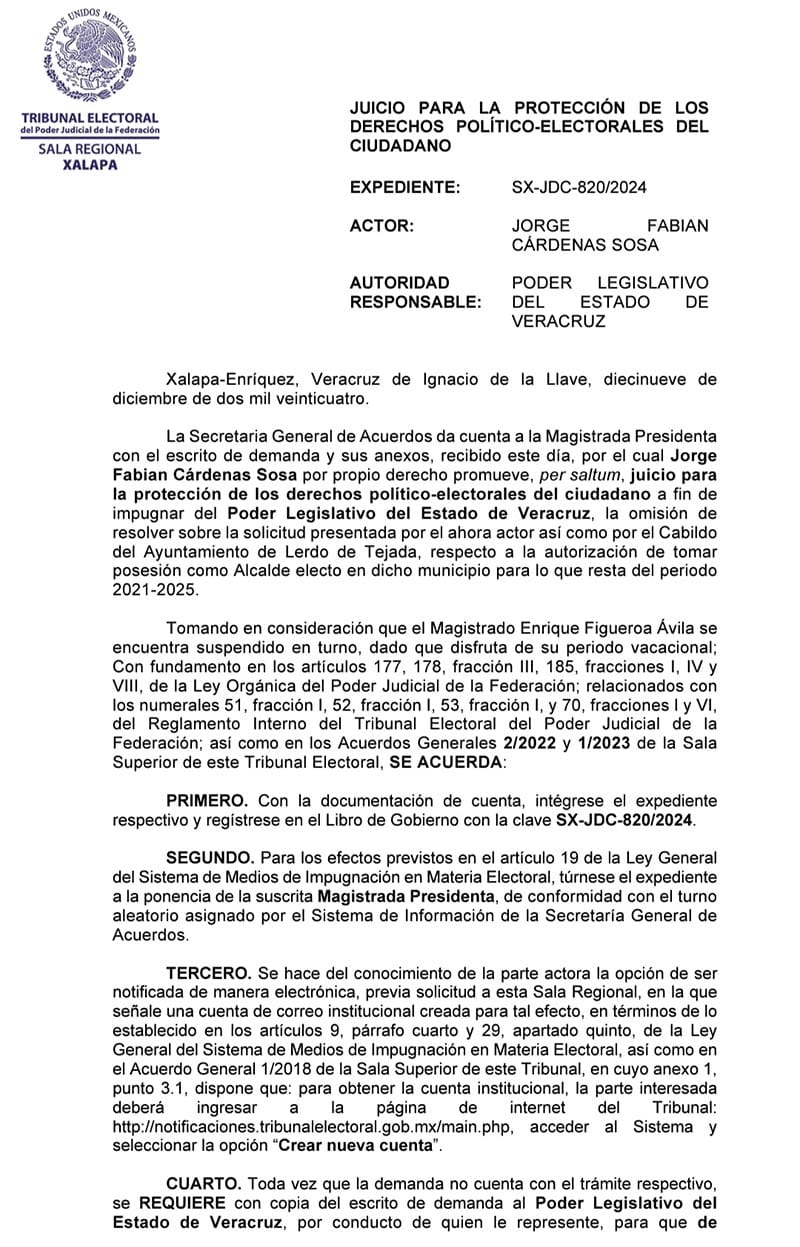 El alcalde electo por Morena del municipio de Lerdo de Tejada; Veracruz, Jorge Fabián Cárdenas Sosa, presentó ante la Sala Regional Xalapa del Tribunal Electoral del Poder Judicial de la Federación (TEPJF) un juicio para la Protección de sus Derechos Políticos Electorales, luego que solicitó junto con el Cabildo del Municipio de Lerdo de Tejada, ante el Congreso del Estado de Veracruz que se le permita tomar protesta del cargo que gano via el voto popular, tras ser liberado despues de pasar más de tres años injustamente en prisión.