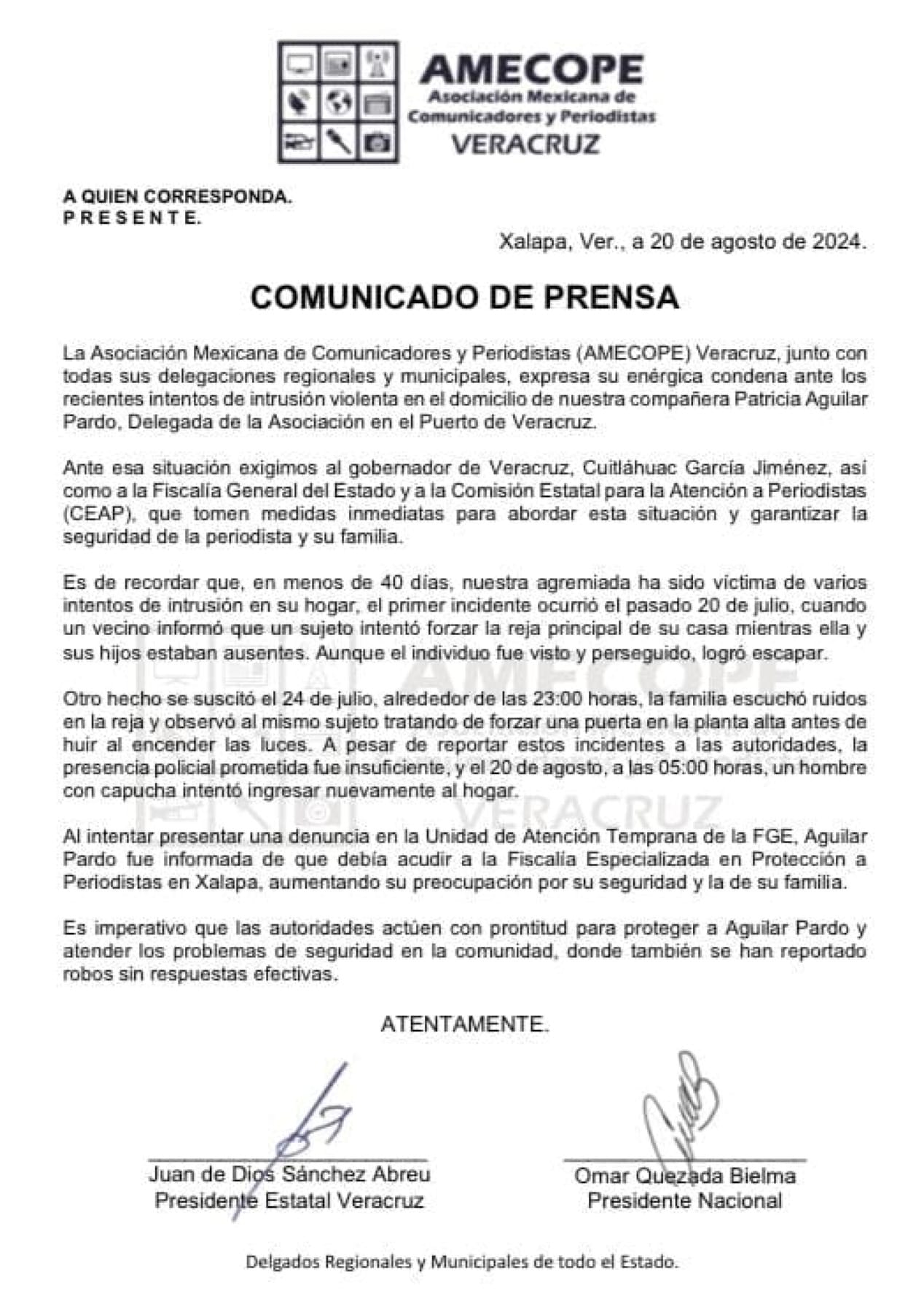 La periodista veracruzana Patricia Aguilar Pardo sufrió por tercera ocasión y en menos de 40 días, otro intento de robo dentro de su domicilio ubicado en la zona centro de la ciudad de Veracruz.