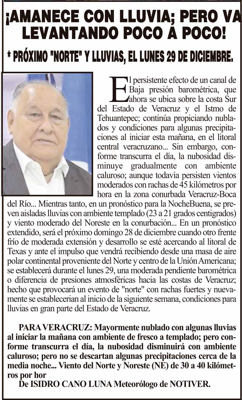 PRIMERA ¡AMANECE CON LLUVIA; PERO VA LEVANTANDO POCO A POCO! - *PRÓXIMO "NORTE" Y LLUVIAS, EL LUNES 29 DE DICIEMBRE. 23 diciembre 2025 Más Noticias ¡‘CAZAN’ AL SERVAL DE LA RIVIERA! ¡QUE LO PROTEJAN! - *PAN pide medidas para alcalde de Banderilla ¡SE CAEN LAS REMESAS! - PURAS PÉRDIDAS ¡EMERGENCIA EN PEMEX! - SE PRENDE DUCTO EN PAJARITOS ¡MULTARÁN A CONSTRUCTORAS! - TENÍA QUE SER ¡SOLUCIONAN PROBLEMÁTICA VECINAL! - *Con visitas sorpresas dice Maryjose LOS CARTONES ¡APOYARÁN CON TODO A VALERIA! ¡DENUNCIA INTENTO DE ‘LEVANTÓN’ EN ESTACIONAMIENTO DE BOCA DEL RÍO! LA ENCUESTA | - SUBIERON!