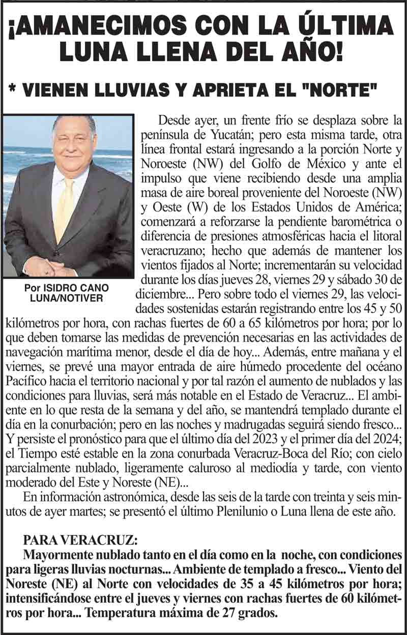 PRIMERA ¡AMANECIMOS CON LA ÚLTIMA LUNA LLENA DEL AÑO! ¡AMANECIMOS CON LA ÚLTIMA LUNA LLENA DEL AÑO! 27 diciembre 2023 Más Noticias ¡CHAPOPOTE EN LA PLAYA CARRIZAL! - Y RECOGEN CASI UNA TONELADA ASEGURAN 16 MOTOS EN OPERATIVO ANTIRODADAS... ¡OPERATIVO DE LA FGR! - CONTRA MAQUINITAS ¡HAY 51 CASOS! - DE SARAMPIÓN ¡INFIERNO EN LA CARRETERA! - ARDE DOBLE REMOLQUE DE COMBUSTIBLE ¡MÁS DE 24 MIL BOQUEÑOS TIENEN UNA DISCAPACIDAD! ¡NO QUIEREN EL FRACKING! - AY NANITAS ¡OTRA TORTUGA MUERTA! ¡REAPARECE “PATOCHIS ”! - AGÁRRENSE... ¡LOS RESCATAN! - LA SEMAR