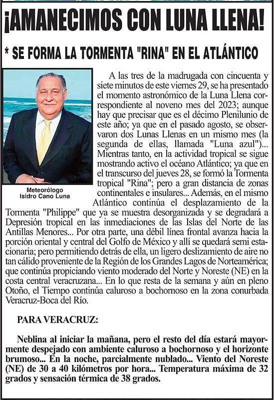 PRIMERA ¡AMANECIMOS CON LUNA LLENA! * SE FORMA LA TORMENTA "RINA" EN EL ATLÁNTICO 29 septiembre 2023 Más Noticias ¡YA HAY TERNA! - RAÚL PEIMBERT EN LA LISTA ¡“CEMENTERIO”! - DE ULÚAS ¡INAUGURA PATY OTRA CALLE! ¡NO LE CREYERON! - Y LO BUSCAN NOTI-MEME | - ECOS DEL INFORME! ¡VERÓNICA VA CON NAHLE! - Y AL CONGRESO ¡“FAST TRACK”! - *Mientras el Mariner salía y entraba de Pajaritos en Coatzacoalcos ¡OPERATIVO LUPE-REYES! ¡MANDAN LA BILLETIZA! - *Corea manda 150 mil dólares ¡CRISTINA GANA LA ELECCIÓN!