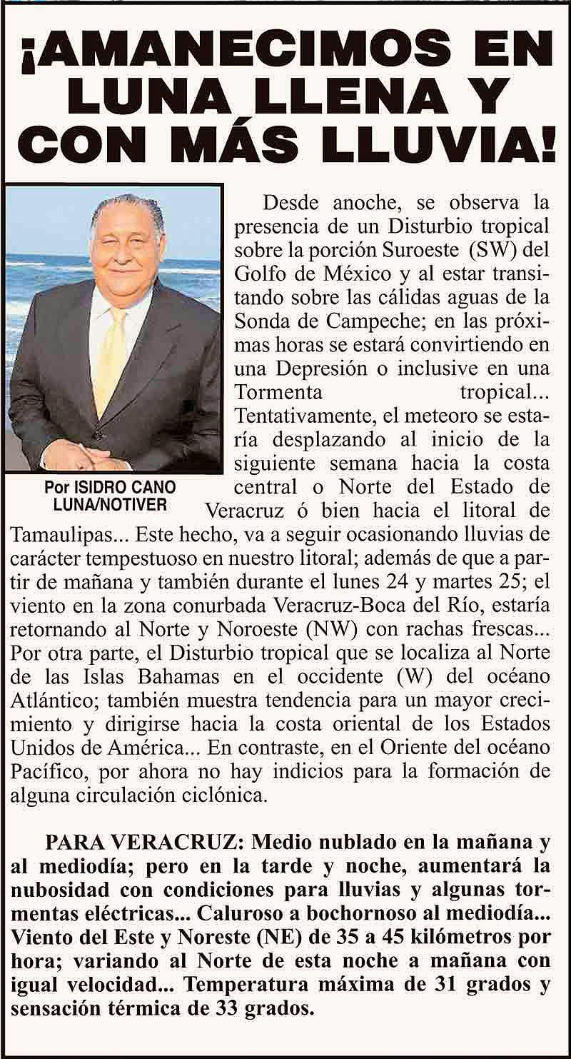 PRIMERA ¡AMANECIMOS EN LUNA LLENA Y CON MÁS LLUVIA! - TEMPERATURA MÁXIMA DE 31 GRADOS 22 junio 2024 Más Noticias ¡YA HAY TERNA! - RAÚL PEIMBERT EN LA LISTA ¡“CEMENTERIO”! - DE ULÚAS ¡INAUGURA PATY OTRA CALLE! ¡NO LE CREYERON! - Y LO BUSCAN NOTI-MEME | - ECOS DEL INFORME! ¡VERÓNICA VA CON NAHLE! - Y AL CONGRESO ¡“FAST TRACK”! - *Mientras el Mariner salía y entraba de Pajaritos en Coatzacoalcos ¡OPERATIVO LUPE-REYES! ¡MANDAN LA BILLETIZA! - *Corea manda 150 mil dólares ¡CRISTINA GANA LA ELECCIÓN!