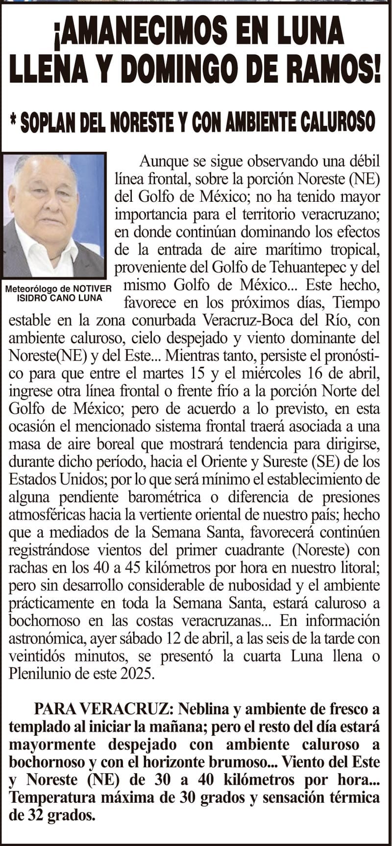 PRIMERA ¡AMANECIMOS EN LUNA LLENA Y DOMINGO DE RAMOS! - *SOPLAN DEL NORESTE Y CON AMBIENTE CALUROSO 13 abril 2025 Más Noticias ¡LA PREMIAN EN LA UV! - A SÚPER ESTUDIANTE ¡ACATAN SENTENCIA! - CASO ASCENSIO ¡OPERATIVO “SALVAVIDAS”! ¡TAMBIÉN TAMBORES DE GUERRA! - UYUYYYY ¡VIRGILIO TORRES A TRÁNSITO! - *Era el segundo de Andrés Delgado, en la delegación de Medellín ¡EJECUTAN A LÍDER DE TAXISTAS! - EN ACAYUCAN ¡TIENEN MELLO! - AY NANITAS ¡CUMPLE MANDINGA 425 AÑOS! - *Viene un Príncipe de Camerún NOTI-MEME | - ''LOS GRINCHS'' LOS CARTONES