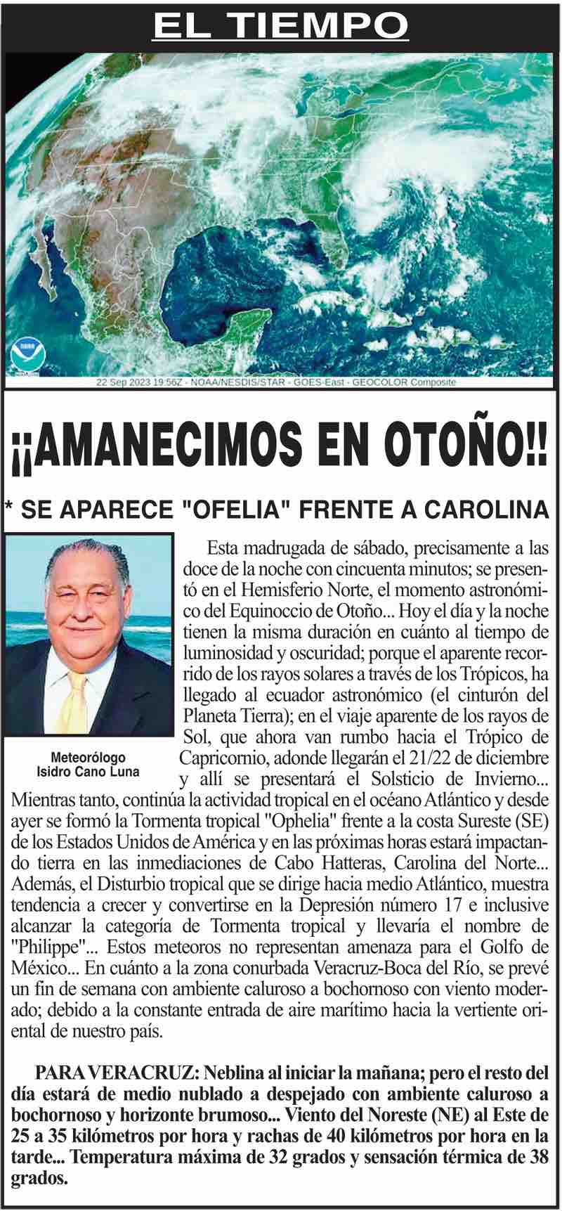 PRIMERA ¡¡AMANECIMOS EN OTOÑO!! * ¡¡AMANECIMOS EN OTOÑO!! * SE APARECE "OFELIA" FRENTE A CAROLINA 23 septiembre 2023 Más Noticias ¡ASESINAN A EX CANDIDATO A LA ALCALDÍA DE MISANTLA! - *Era del Movimiento Ciudadano ¡HOMENAJE PÓSTUMO AL “PAPO”! ¡SE VA EL FOFO! - DEL PRI LA ENCUESTA | - FELICIDADES! ¡SE DESCARRILA EL TREN! - PA’SUSTO ¡YA NO COBRARÁN PARQUÍMETROS! ¡SE VAN POR LAS NUBES LOS PAVOS! ¡DETECTAR DISFAGIA A TIEMPO PREVIENE LAS COMPLICACIONES DE SALUD: IMSS VERACRUZ NORTE! ¡CUATRO MUNICIPIOS SUBIRÁN EL PREDIAL! - YA SE SUPO ¡CUMBRE DE TRANSPORTE MULTIMODAL!