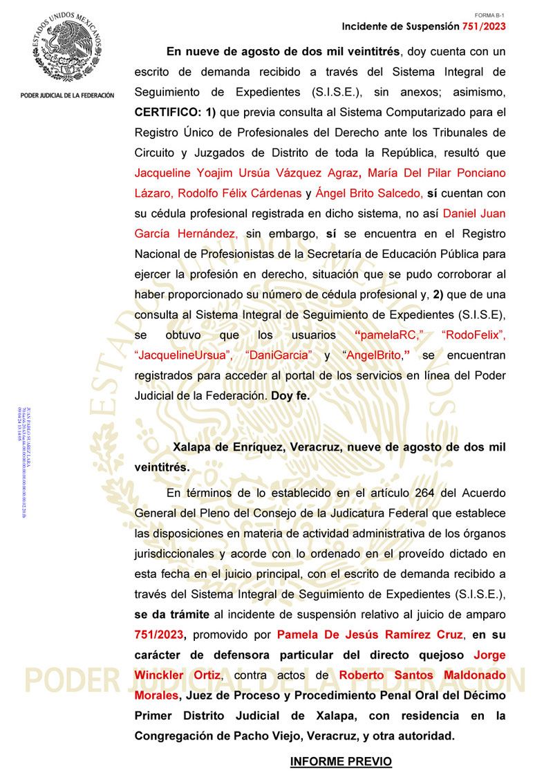 El Juzgado Decimoséptimo de Distrito en el Estado de Veracruz, otorgó una suspensión provi- sional al ex fiscal de Veracruz Jorge Winckelr Ortiz, para que en una audiencia se revise y se le elim- ine la medida cautelar de prisión preventiva oficiosa.