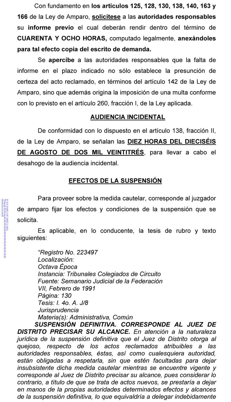 “Se considera respetuosamente que debe concederse la suspensión provisional del acto reclamado, bajo la consideración que los efectos tasados pre- vistos en el artículo 166 de la Ley de Amparo, no constituyen un límite para que la suspensión pueda tener mayores y mejores alcances en la protección anticipada de derechos fundamentales” dice el documento.
