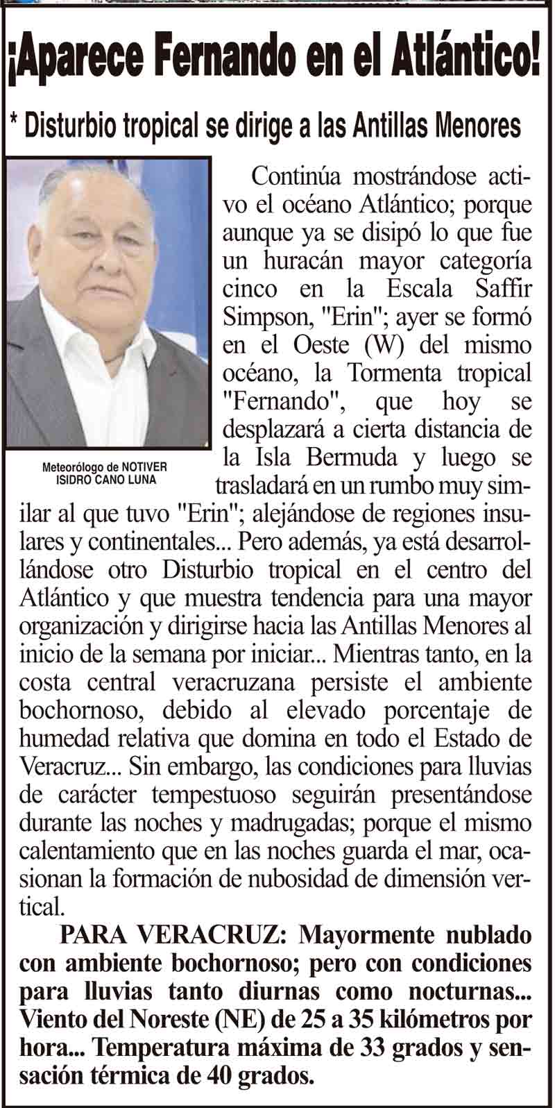 PRIMERA ¡APARECE FERNANDO EN EL ATLÁNTICO! - *DISTURBIO TROPICAL SE DIRIGE A LAS ANTILLAS MENORES 24 agosto 2025 Más Noticias ¡HOY SOPLA FRESCO Y DE FRENTE! - *PERO EL LUNES 8, ESTARÁ FUERTE Y CON LLUVIAS. LA ENCUESTA | - ME ESTÁS OYENDO INÚTIL?... ¡CON BAILONGOS QUIEREN AYUDAR A LOS DAMNIFICADOS DEL NORTE! - *El mismo Alor, toca los timbales ¡YA SE LA APROBARON! - REFORMA PARA LA FISCALÍA ESTATAL NOTI-MEME | - ASÍ ESTUVO EL INFORME... ¡MÁS DE 9 MIL MILLONES! - *Eso costaría cancelar en Veracruz al Grupo MAS ¡LE DAN LUZ VERDE! - DESDE GUATEMALA ¡EL CUARTO! ¡Y COM-PA-RE-CIÓ! - ÁNDALE... ¡NO SE VA LISBETH AURELIA! - *Descarta ir a la Fiscalía y que seguirá como magistrada