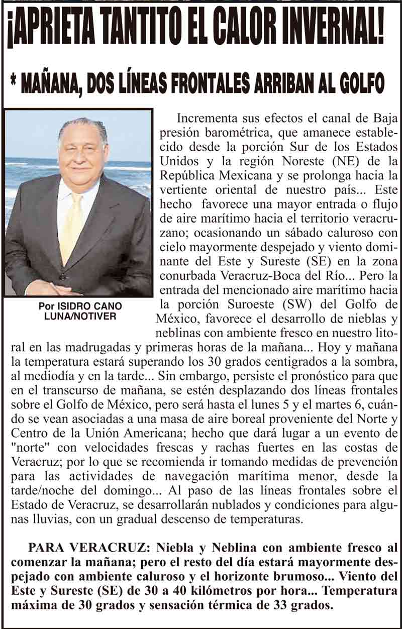 PRIMERA ¡APRIETA TANTITO EL CALOR INVERNAL! * MAÑANA, DOS LÍNEAS FRONTALES ARRIBAN AL GOLFO 3 febrero 2024 Más Noticias LA PORTADA - SÁBADO 6 DE DICIEMBRE 2025 ¡SE ESTÁ FORMANDO UN INTENSO "NORTE" PARA EL LUNES 8! - *UN FIN DE SEMANA CON CALOR, BRUMA Y DEL ESTE ¡YA HAY TERNA! - RAÚL PEIMBERT EN LA LISTA ¡“CEMENTERIO”! - DE ULÚAS ¡INAUGURA PATY OTRA CALLE! ¡NO LE CREYERON! - Y LO BUSCAN NOTI-MEME | - ECOS DEL INFORME! ¡VERÓNICA VA CON NAHLE! - Y AL CONGRESO ¡“FAST TRACK”! - *Mientras el Mariner salía y entraba de Pajaritos en Coatzacoalcos ¡OPERATIVO LUPE-REYES!