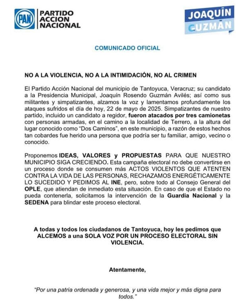 “Condenamos el cobarde ataque del 22 de mayo contra simpatizantes del PAN, entre ellos un candidato a regidor. Esto no solo atenta contra nuestro movimiento, atenta contra todas y todos los tantoyuquenses. Exigimos una elección limpia, con propuestas, respeto y valores. Pedimos al INE México y al OPLE Veracruz actuar con firmeza y, si es necesario, que intervenga la Guardia Nacional y la SEDENA para garantizar la seguridad en este proceso. Hoy más que nunca, unámonos por un Tantoyuca libre, en paz y sin miedo”, se lee en el comunicado.