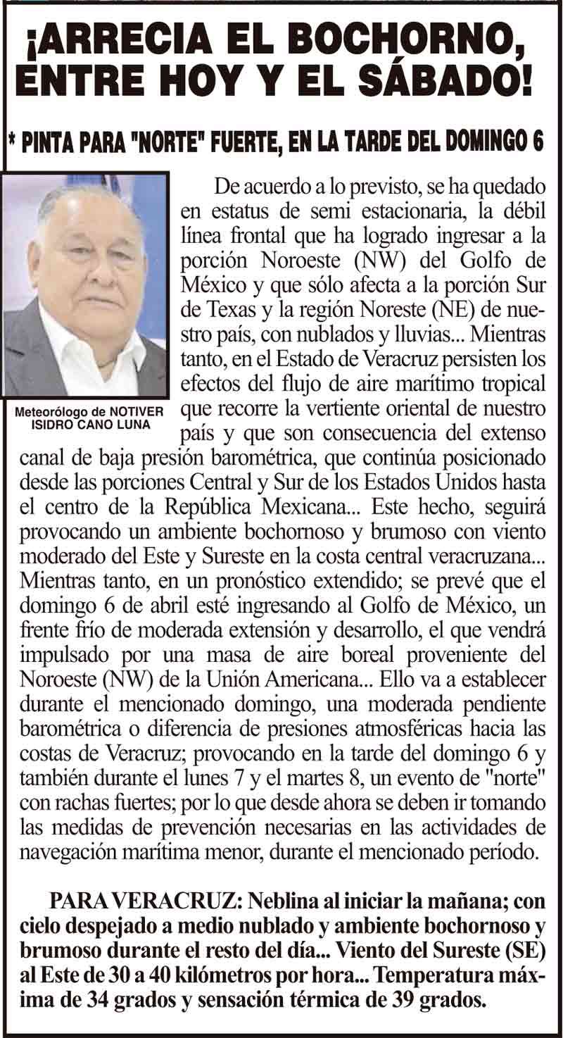 PRIMERA ¡ARRECIA EL BOCHORNO, ENTRE HOY Y EL SÁBADO! - *PINTA PARA "NORTE" FUERTE, EN LA TARDE DEL DOMINGO 6 1 abril 2025 Más Noticias ¡YA TIENE PUENTAZO EL SEGURO! ¡LA CARTELERA! | LA ÚLTIMA Y NOS VAMOS - De vacaciones andamos en Papantla, Veracruz, y en días pasados escuchamos dos charlas sobre los exploradores y la iconografía del basamento de los Nichos y El Tajín, en el Museo Teodoro Cano… ¡MAESTROS TENDRÁN BONO Y AGUINALDO! ¡LES MOCHAN EL AGUA A RÍO MEDIO! - *Por mantenimiento ¡SALE HUMO DE LAS ALCANTARILLAS! - *Explosiones en Jardines de Mocambo ¡LEY GARROTE! - *Paguen ya impuestos o van multas ¡YA TIENE MURAL TITO NIEVES! ¡PRESENTA LOTERÍA NACIONAL EL ÁLBUM DEL MUNDIAL! LOS CARTONES ¡PREVENCIONES PARA EVITAR EL INCREMENTO DE LAS INFECCIONES RESPIRATORIAS AGUADAS!
