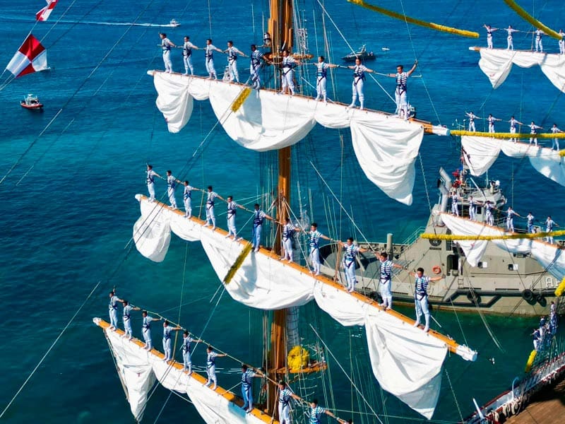 Este lunes se realizó una ceremonia cívica de izamiento de bandera monumental para recibir a la tripulación, estará abierto al público toda la semana y sale el próximo viernes a las 10 de la mañana.