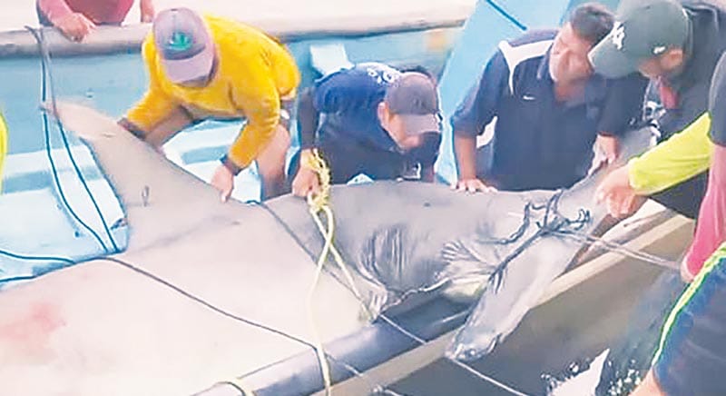 El gran ejemplar trató de zafarse y rompió una red sin embargo lograron capturarlo y después de subirlo a su lancha desembarcaron en Puerto.