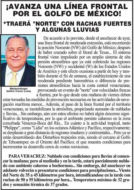 PRIMERA ¡AVANZA UNA LÍNEA FRONTAL POR EL GOLFO DE MÉXICO! *TRAERÁ "NORTE" CON RACHAS FUERTES Y ALGUNAS LLUVIAS 6 octubre 2023 DeGarridoMontiel/NOTIVER Más Noticias ¡LOS DEJARON SOLOS! - MORENA VUELVE A REVENTAR SESIÓN ¡VIENEN DESDE COLOMBIA A LA NAVAL! LOS CARTONES ¡NI MEDICAMENTOS NI UNIFORMES! - *En hospital de Boca del Río ¡SE TRAEN CUMBRE AUTOMOTRIZ! ¡REBAMBARAMBA! - MANIOBRISTAS VS. MANIOBRISTAS ¡LO HOMOLOGAN! - *El feminicidio en Veracruz ¡MEGA-CABALGATA! ¡JUSTICIA PARA BERTHA! - MARCHAS POR LA DOCTORA ¡YA HAY PLAN DE DESARROLLO!