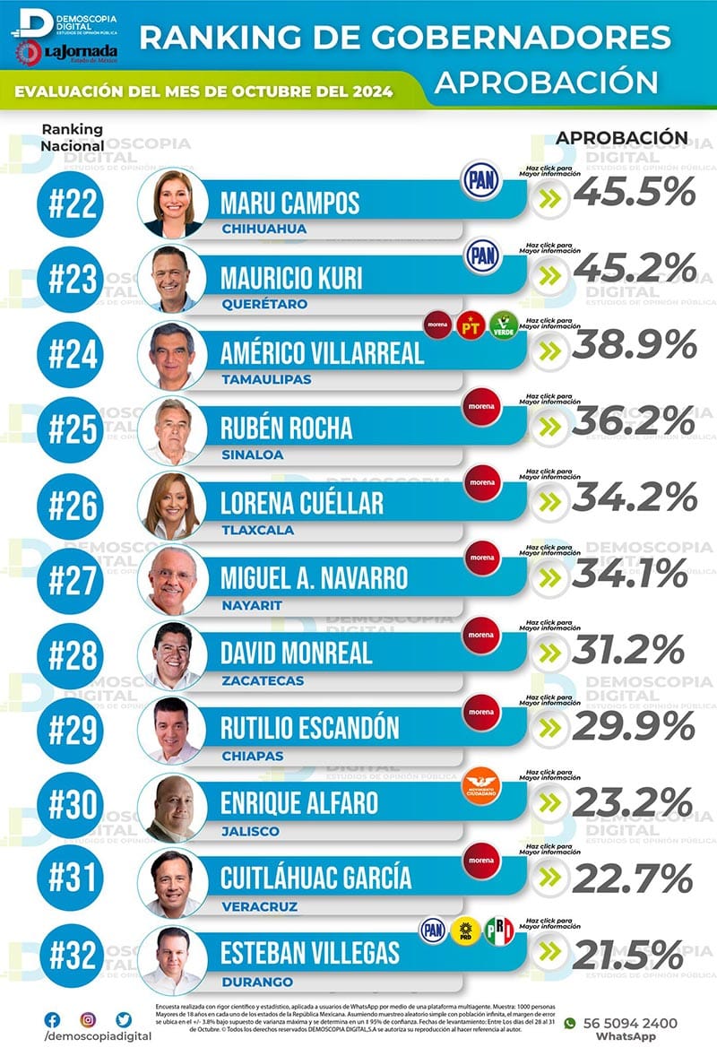 En el número 30 está Enrique Alfaro de Jalisco, 29 Rutilo Escandón, David Monreal de Zacatecas en el 28, Miguel Navarro de Nayarit en el 27, Lorena Cuéllar en el 26 de Tlaxcala, Rubén Rocha de Sinaloa el 25.