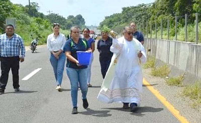 En un hecho inusitado un Sacerdote subió a la batea de una camioneta y con una cubeta llena de agua bendita y ramaje, empezó a bendecir una carretera en el sur de Veracruz, para pedir al creador disminuyan el número de accidentes.