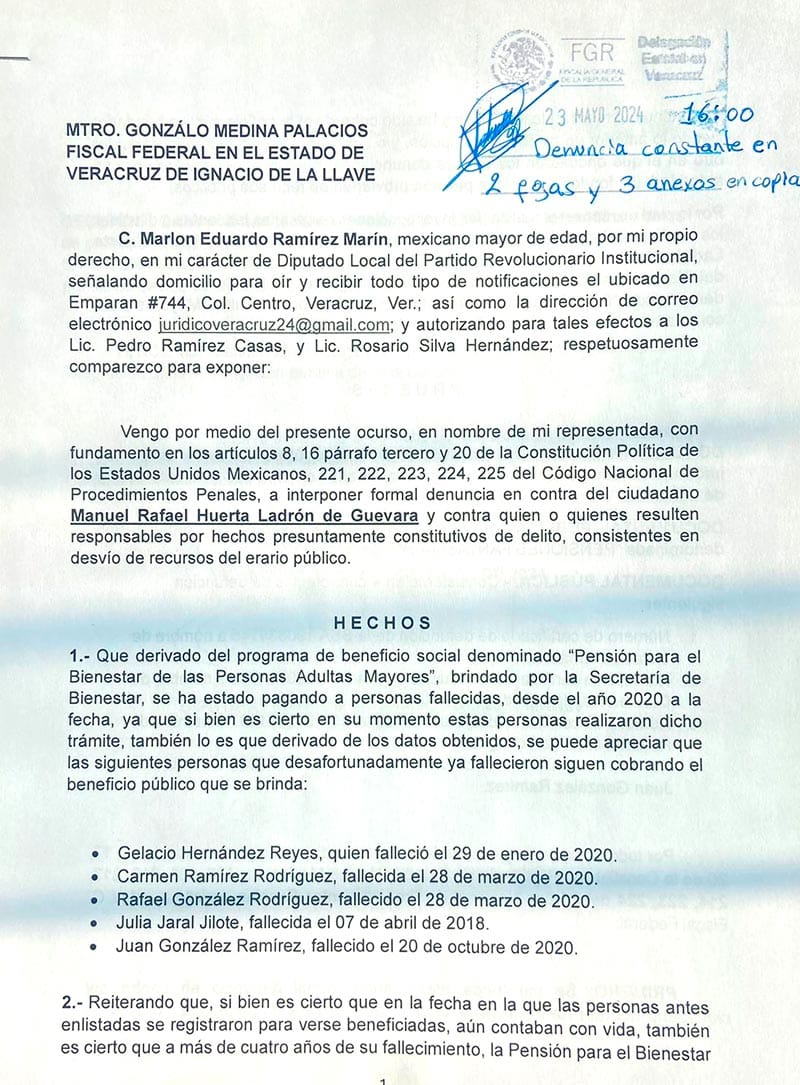 XALAPA, Ver.- Este jueves, el diputado local priista, Marlon Ramírez Marín, interpuso ante la Fiscalía General de la República una denuncia en contra de Manuel Huerta Ladrón de Guevara, exdelegado estatal de la Secretaría del Bienestar, y contra quienes resulten responsables, por desvío de recursos del programa Pensión para el Bienestar de Personas Adultos Mayores.
