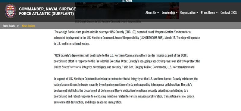 “El despliegue del USS Gravely contribuirá a la misión fronteriza sur del Comando Norte de los EE. UU. como parte del esfuerzo coordinado del Departamento de Defensa en respuesta a la Orden Ejecutiva Presidencial. La capacidad de navegación del Gravely mejora nuestra capacidad para proteger la integridad territorial, la soberanía y la seguridad de Estados Unidos”, declaró el general Gregory Guillot, comandante del Comando Norte de los EE. UU.
