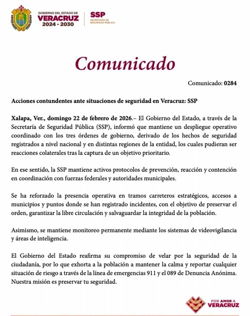 En un comunicado del gobierno de Veracruz a través de la Secretaría de seguridad pública, informó que realizó un operativo coordinado con los tres niveles de gobierno.