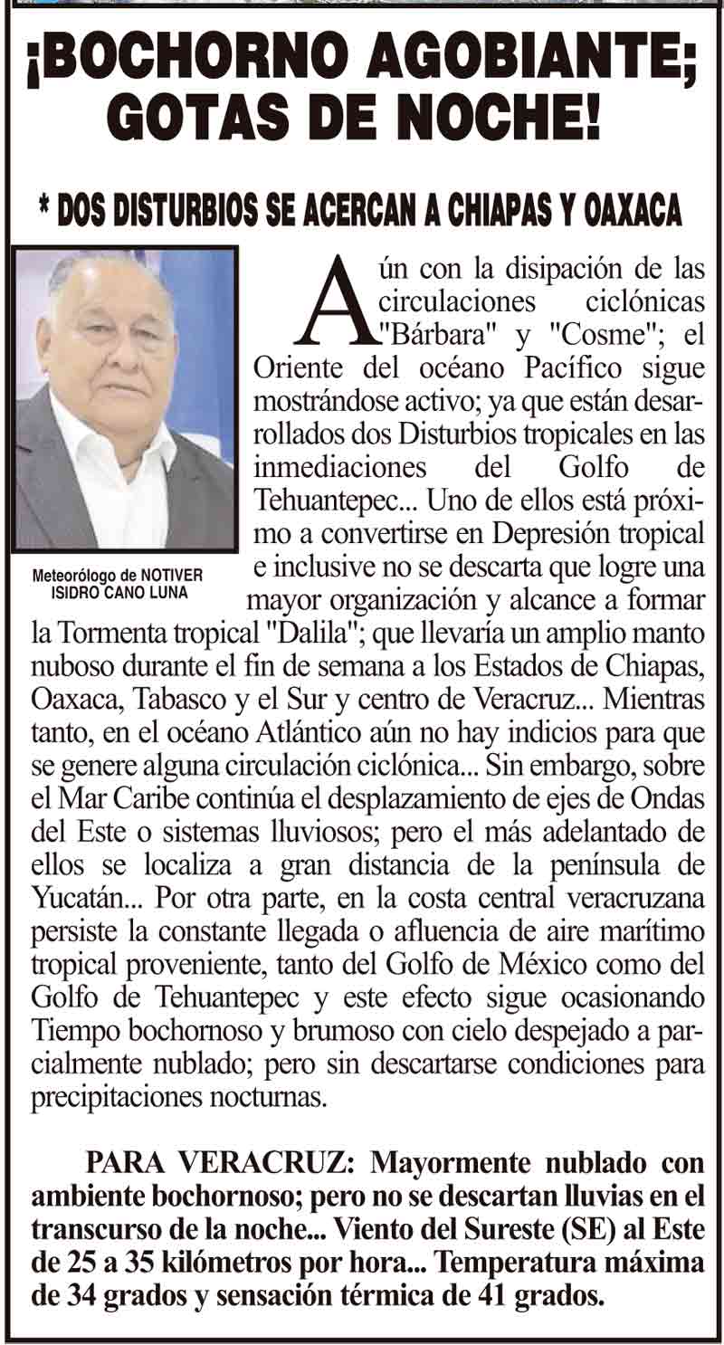 PRIMERA ¡BOCHORNO AGOBIANTE; GOTAS DE NOCHE! - *DOS DISTURBIOS SE ACERCAN A CHIAPAS Y OAXACA 12 junio 2025 Más Noticias ¡ASESINAN A EX CANDIDATO A LA ALCALDÍA DE MISANTLA! - *Era del Movimiento Ciudadano ¡HOMENAJE PÓSTUMO AL “PAPO”! ¡SE VA EL FOFO! - DEL PRI LA ENCUESTA | - FELICIDADES! ¡SE DESCARRILA EL TREN! - PA’SUSTO ¡YA NO COBRARÁN PARQUÍMETROS! ¡SE VAN POR LAS NUBES LOS PAVOS! ¡DETECTAR DISFAGIA A TIEMPO PREVIENE LAS COMPLICACIONES DE SALUD: IMSS VERACRUZ NORTE! ¡CUATRO MUNICIPIOS SUBIRÁN EL PREDIAL! - YA SE SUPO ¡CUMBRE DE TRANSPORTE MULTIMODAL!