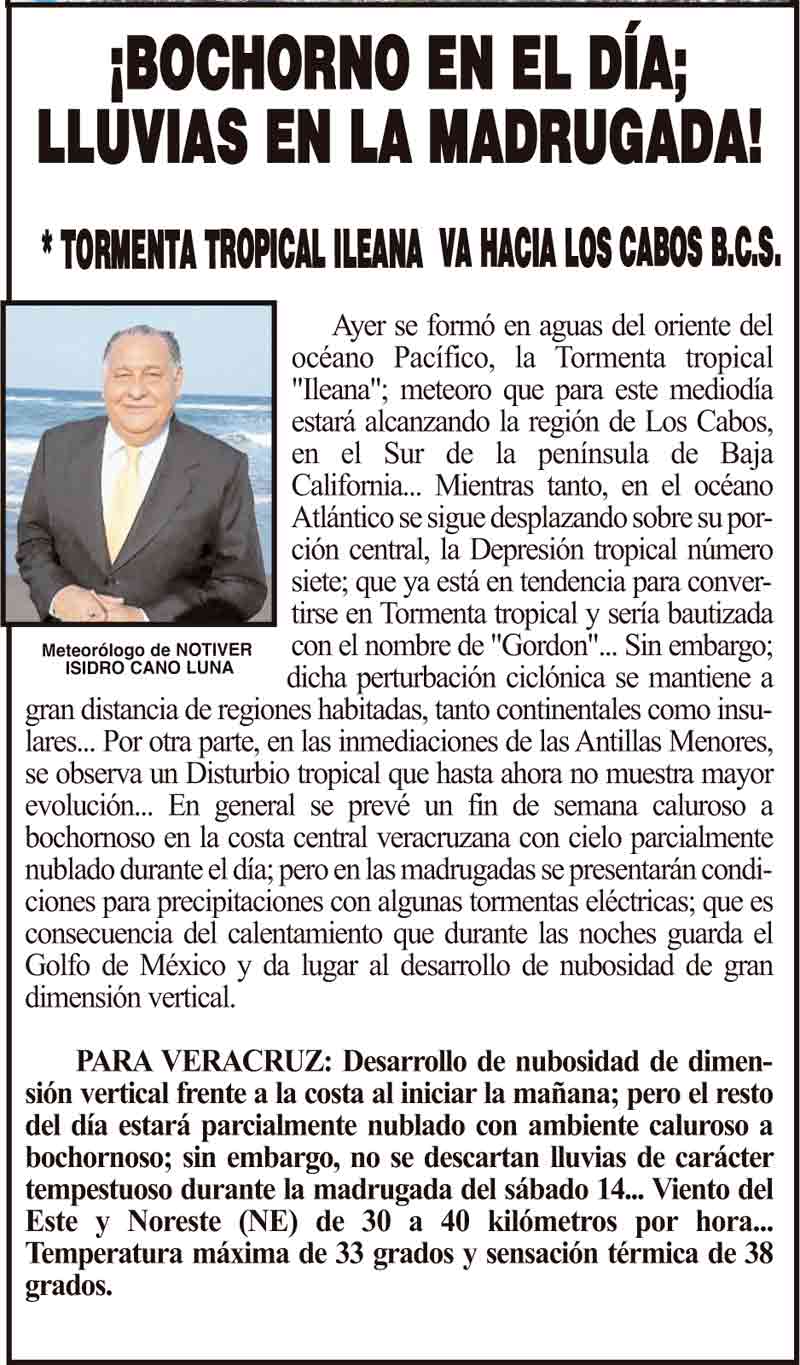 PRIMERA ¡BOCHORNO EN EL DÍA; LLUVIAS EN LA MADRUGADA! - *TORMENTA TROPICAL ILEANA VA HACIA LOS CABOS B.C.S. 13 septiembre 2024 Más Noticias LA PORTADA - SÁBADO 7 DE FEBRERO 2026 ¡MANDAN TORTAS A CUBA! - LAS RECARGAN CON FRIJOLES Y TLACOYOS ¡ROSA MARÍA APOYARÁ LA CULTURA! ¡LA CACHAN CON UN BOLSÓN! - CUAL SUFRIR... ¡ACALAMBRAN OTRO ALCALDE! - AHORA AL DE ZACUALPAN DEL PRI ¡MÁS CASOS DE GUSANO BARRENADOR! - *Reportan dos casos en Veracruz ¡HOMENAJE AL “PAPO”! - Y NACIONAL ¡LE HACEN HASTA PLANTÓN! NOTI-MEME | - Y EN EL CONGRESO... SE PONEN BELLOS COMO EN EL SENADO? ¡MUEVEN AL JEFE DE MIGRACIÓN! - *Mandan un vicealmirante