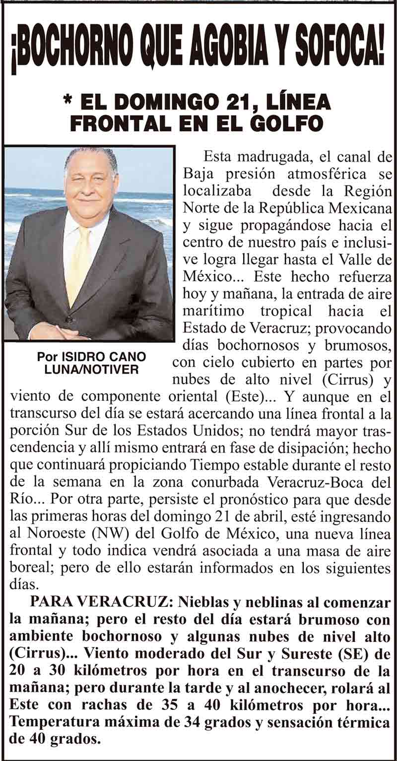 PRIMERA ¡BOCHORNO QUE AGOBIA Y SOFOCA! - * EL DOMINGO 21, LÍNEA FRONTAL EN EL GOLFO 16 abril 2024 Más Noticias ¡YA HAY TERNA! - RAÚL PEIMBERT EN LA LISTA ¡“CEMENTERIO”! - DE ULÚAS ¡INAUGURA PATY OTRA CALLE! ¡NO LE CREYERON! - Y LO BUSCAN NOTI-MEME | - ECOS DEL INFORME! ¡VERÓNICA VA CON NAHLE! - Y AL CONGRESO ¡“FAST TRACK”! - *Mientras el Mariner salía y entraba de Pajaritos en Coatzacoalcos ¡OPERATIVO LUPE-REYES! ¡MANDAN LA BILLETIZA! - *Corea manda 150 mil dólares ¡CRISTINA GANA LA ELECCIÓN!
